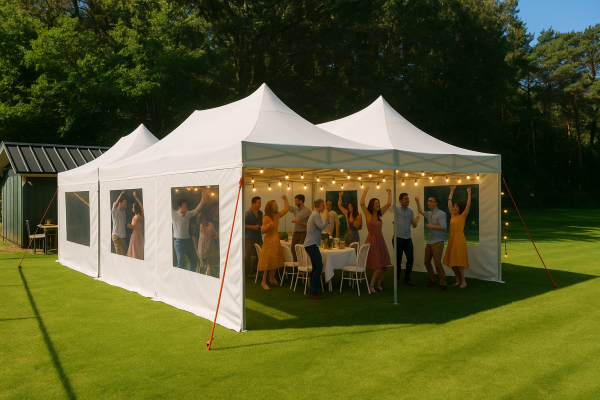 De partytent kan voorzien worden met, deur, raam of dichte zijwanden